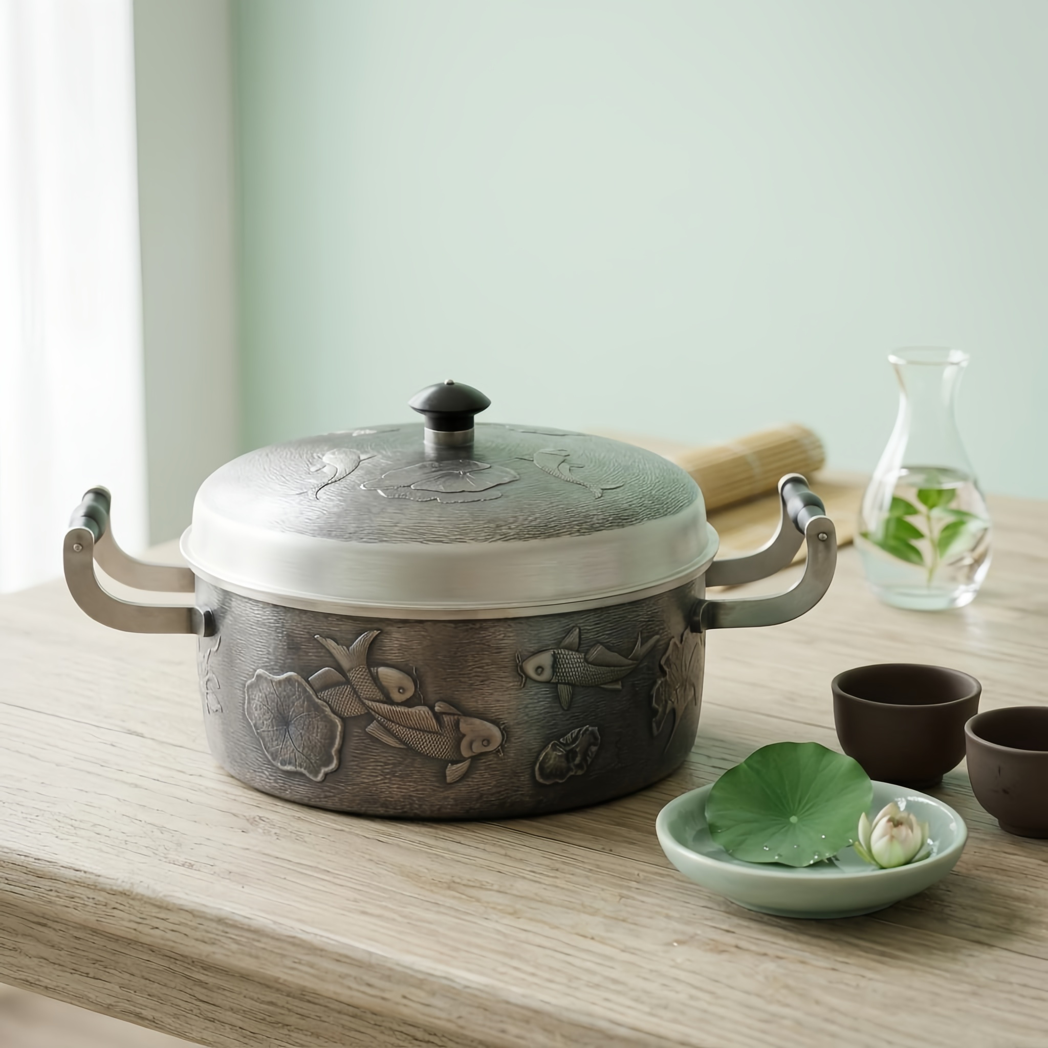 925 Sterling Silver Artistic Metal Cooking Pot with Embossed Koi Fish and Lotus Leaf Design - Handicraft