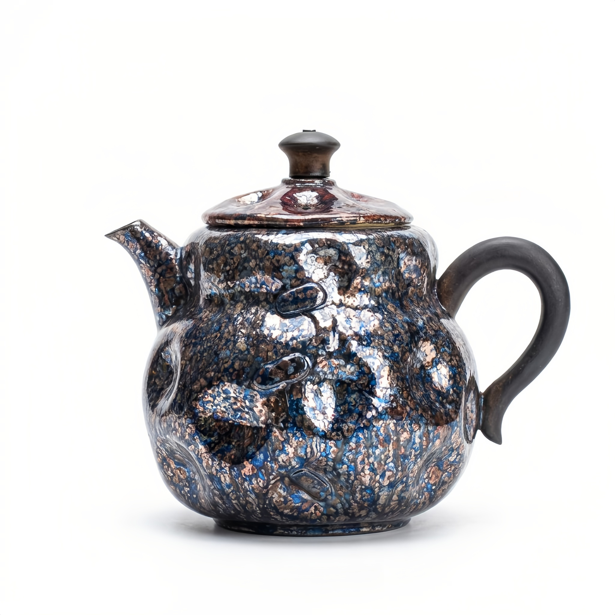 925 Sterling Silver Handcrafted Textured Ceramic Teapot with Iridescent Mottled Blue and Bronze Glaze Finish - Handicraft