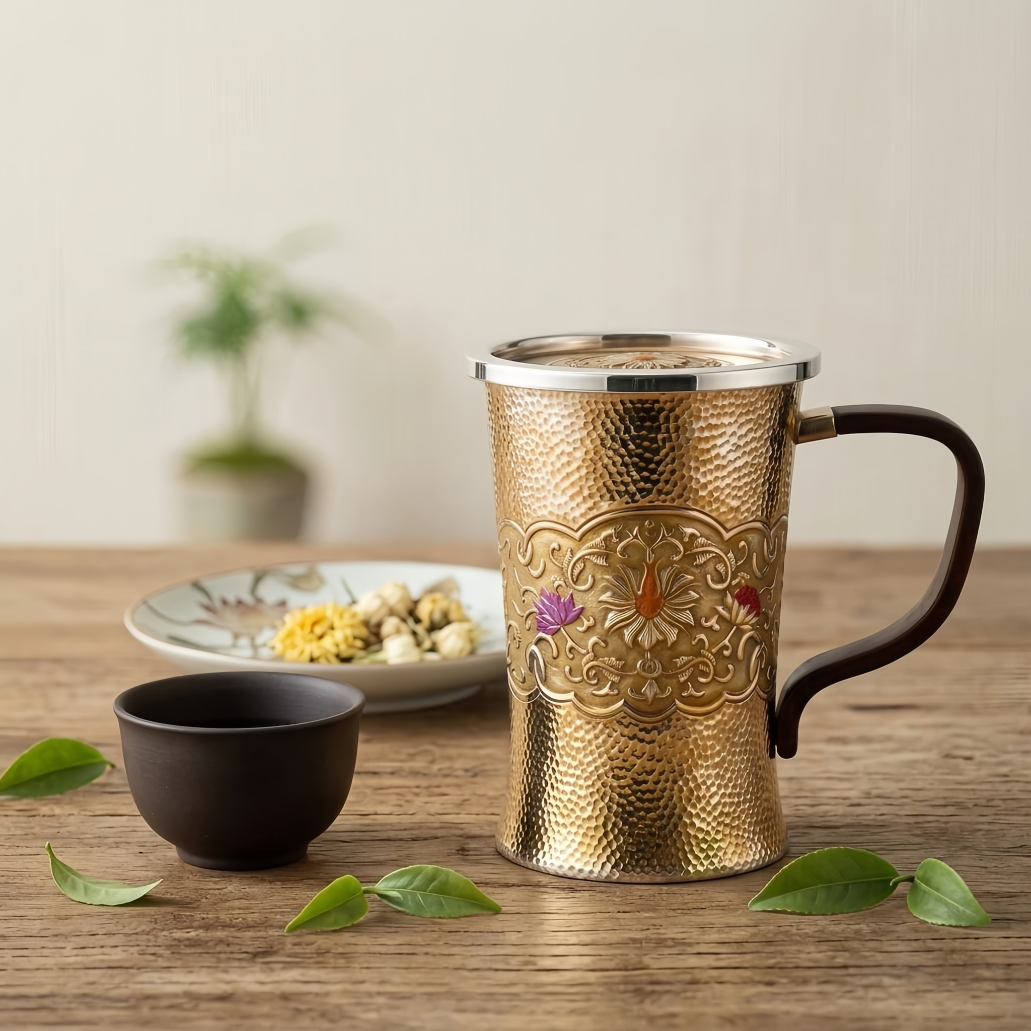 925 Sterling Silver Elegant Handcrafted Hammered Brass Mug with Floral Engravings and Dark Wood Handle - Handicraft