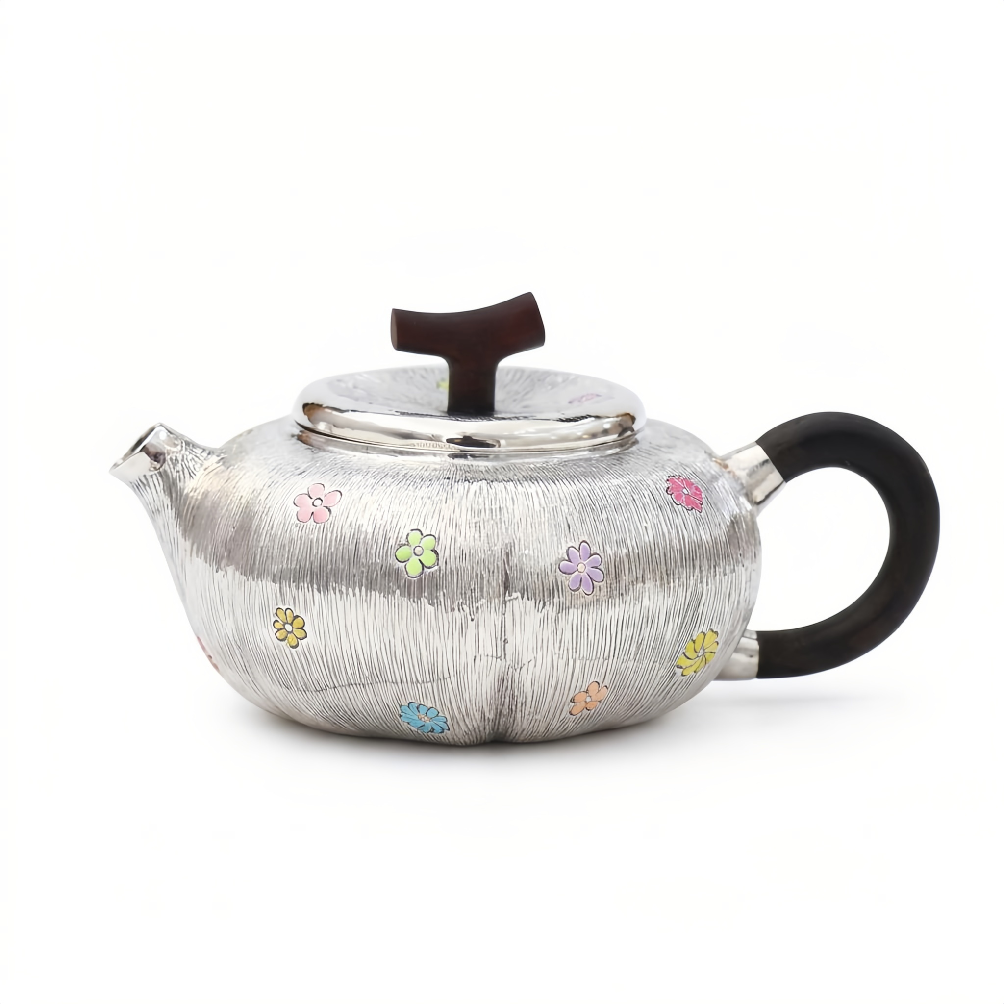 925 Sterling Silver Elegant Textured Silver Teapot with Colorful Enamel Flowers and Dark Wood Handle - Handicraft