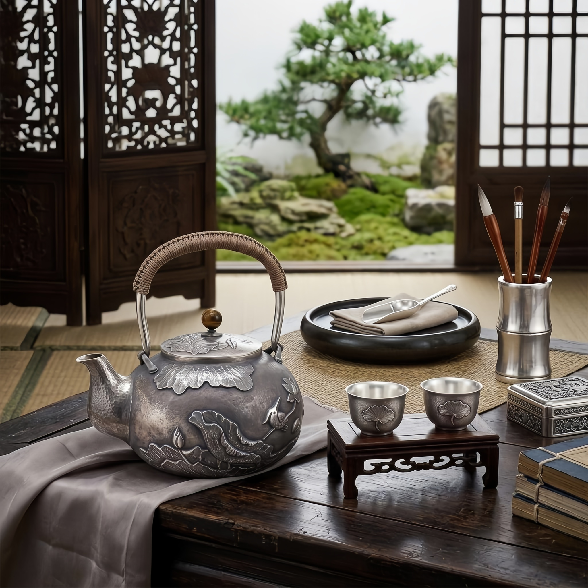 925 Sterling Silver Handcrafted Silver Teapot with Intricate Lotus and Kingfisher Repoussé and Wicker Handle - Handicraft