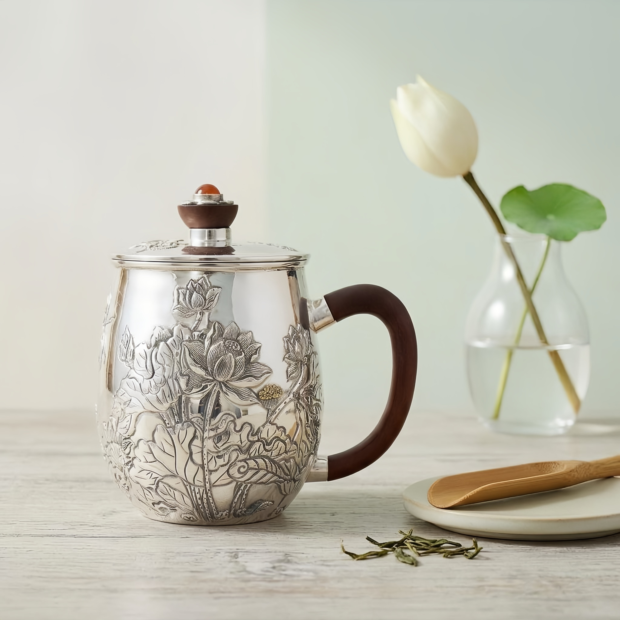 925 Sterling Silver Hand-Engraved Sterling Silver Lotus Tea Mug with Wooden Handle and Carnelian Lid Inlay - Handicraft