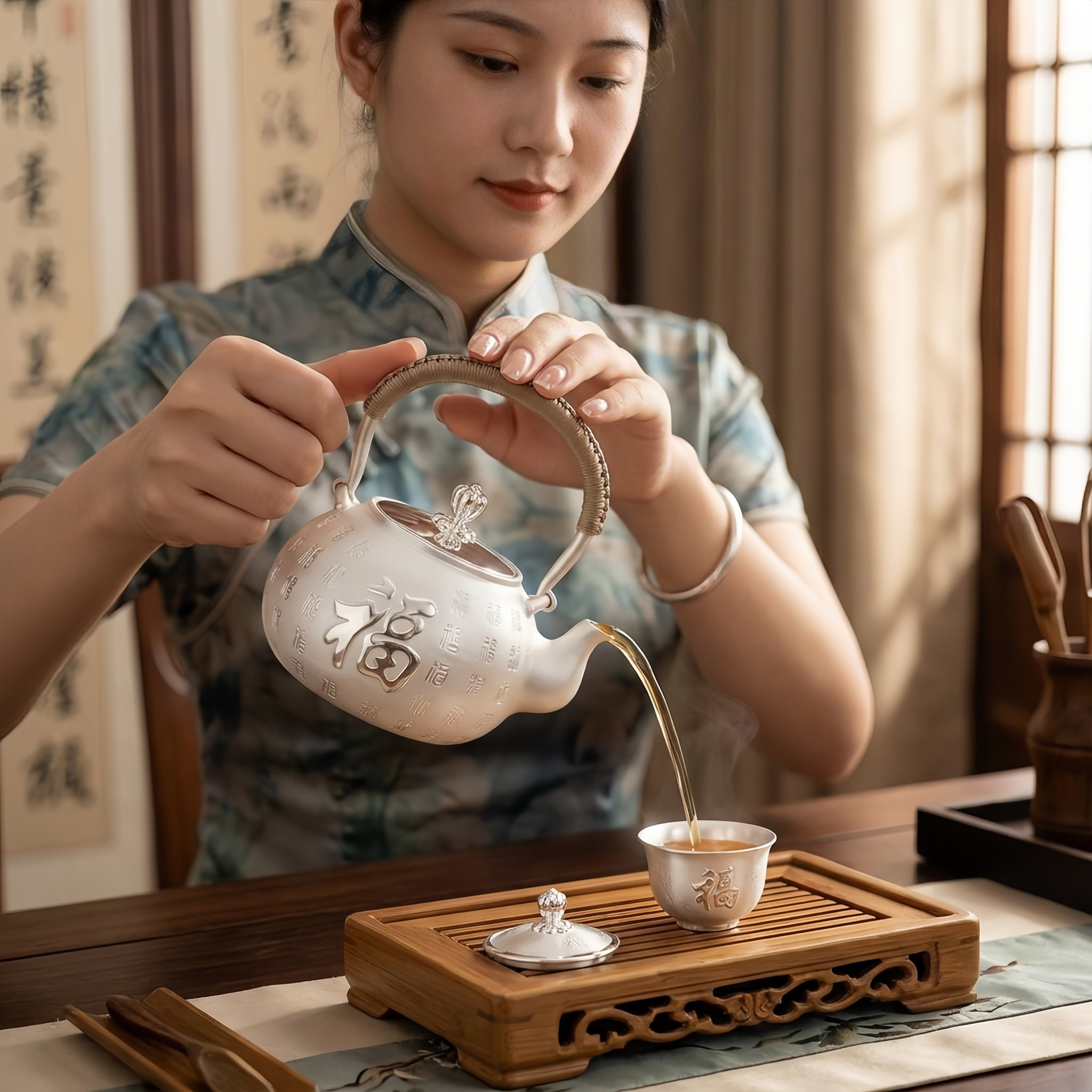 925 Sterling Silver Elegant Silver Teapot with Auspicious Chinese "Fu" Characters and Woven Handle - Handicraft