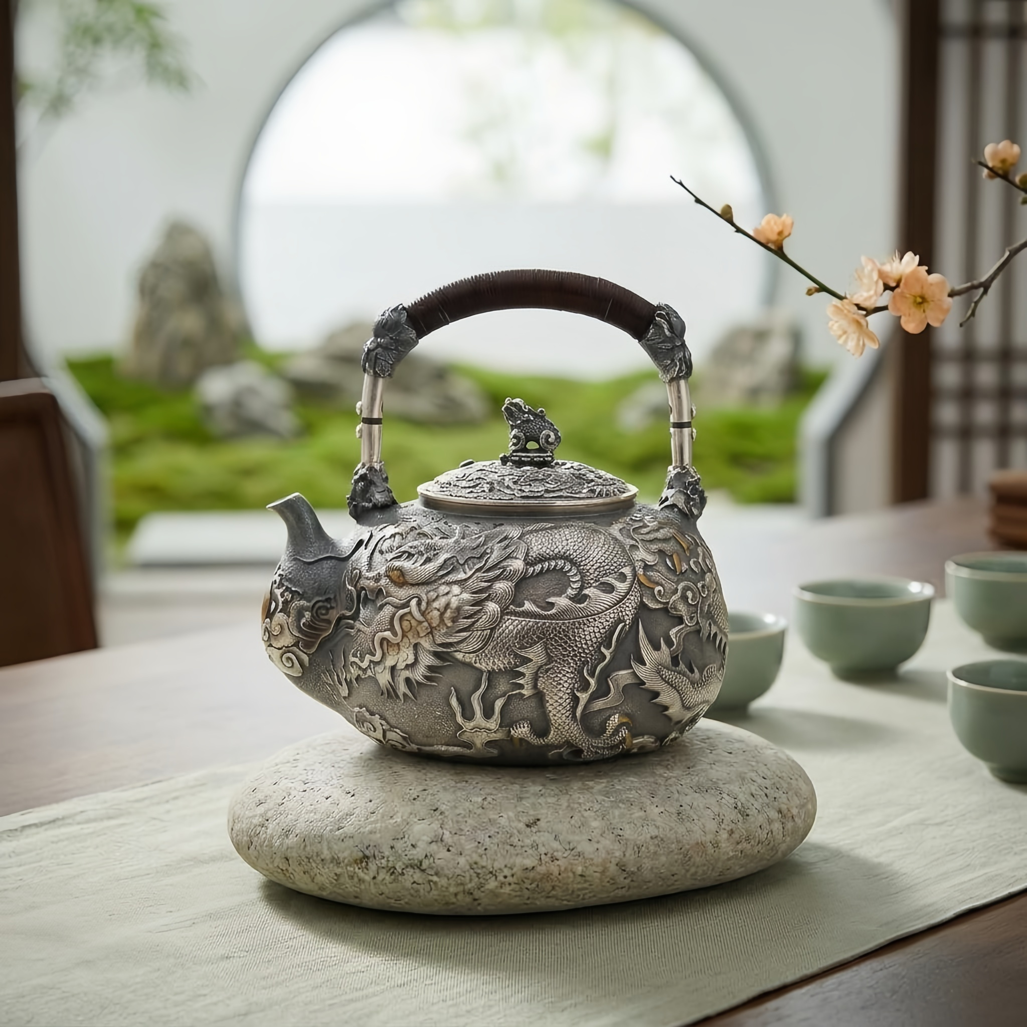 925 Sterling Silver Hand-Carved Silver Dragon Teapot with Intricate Oriental Motifs and Finely Wrapped Handle - Handicraft
