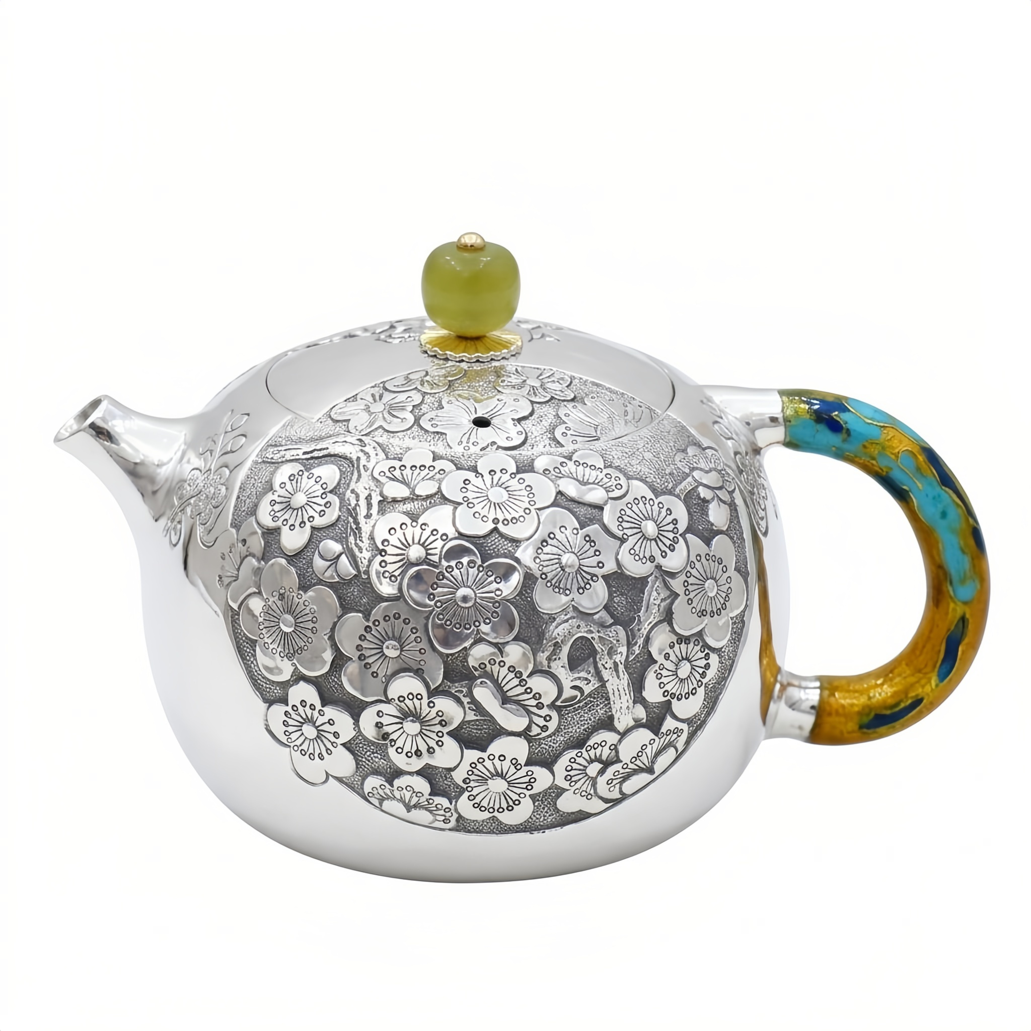 925 Sterling Silver Elegant Teapot with Jade Knob and Enamel Handle-exquisite handmade teapot - Handicraft